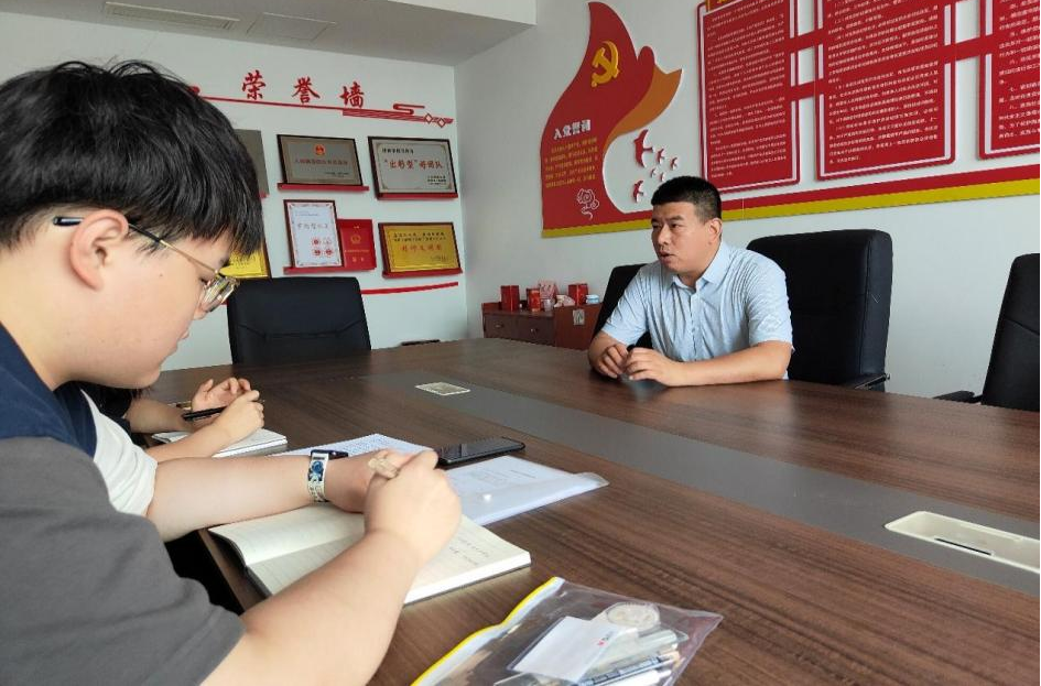 图为钢城分队队员采访钢城区民政局儿童福利科魏主任