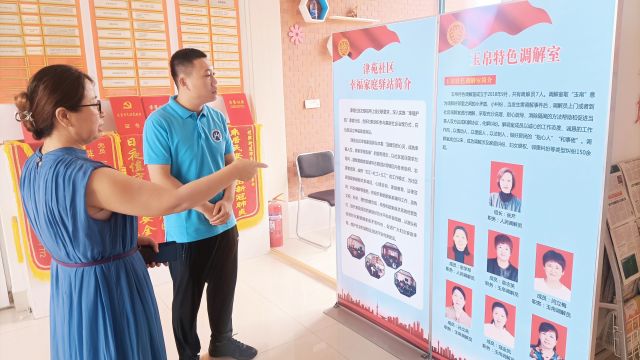 为进一步调研基层矛盾调解运行机制,调研活动第二站团队成员来到了利津街道津苑社区。其中,富有特色的“玉帛调解室”让队员眼前一亮,由7名女性调解员组成的调解队伍,充分发挥了女性亲切真诚、善解人意、耐心细致的特长。团队成员走进调解室,看案例档案,学工作经验,对不涉及个人隐私的资料进行了研读分析、拍照留存,获取了真实可信的一手资料,详细了解调解室的运行机制和工作成果,并就基层社会治理中频发的矛盾类型和成因以及化解方法与工作人员进行探讨交流,