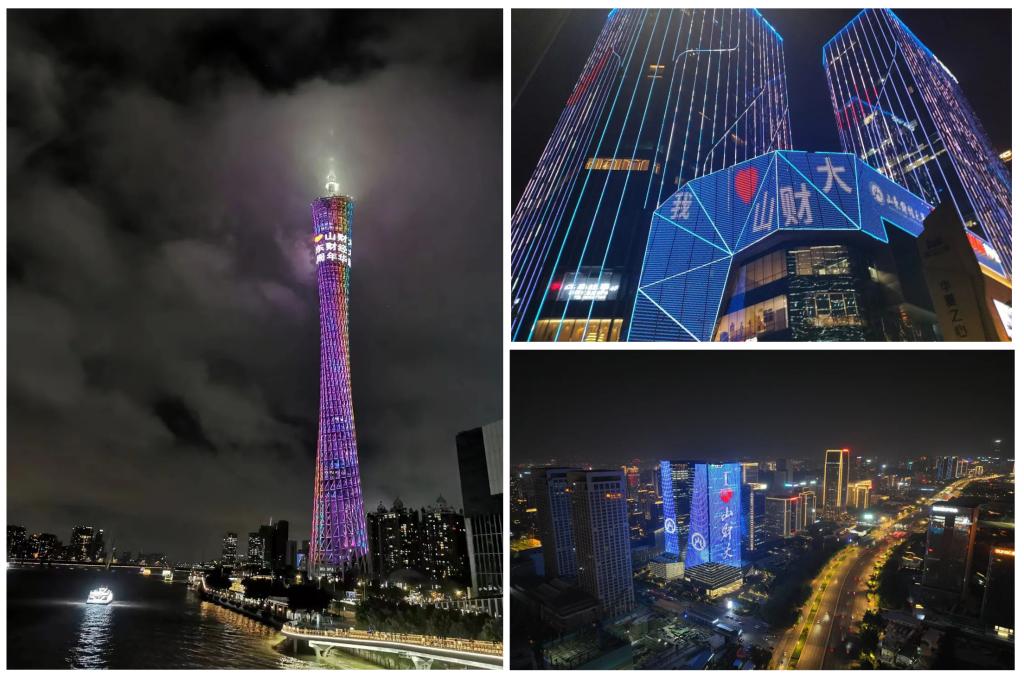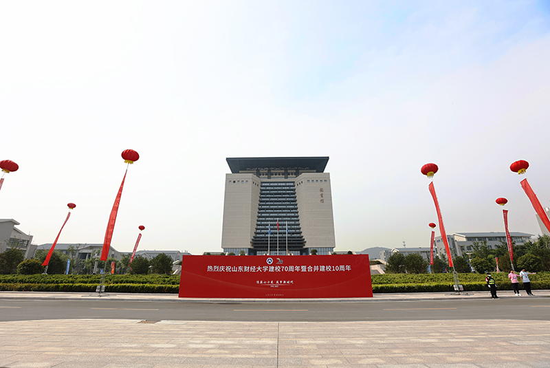 清晨的校园,燕山、圣井和舜耕校区草木葳蕤,凉风吹拂,处处欢声笑语,喜悦写在财大人的脸上,洋溢在举手投足间。圣井校区北门入口,一座中国红巨幅校庆立体标志矗立,仿佛一枚超大的古代贝币,在阳光下热烈而庄重。道路两侧彩旗飘扬,“同心迎校庆,一起向未来” “七十载,风雨兼程;再出发,家国同梦”“风雨七秩,倚泰山临黄河根植齐鲁写就高教隽永篇章;十载砥砺,逢盛世沐国运勃发英姿频传兴学育才弦歌”“亲爱的校友,母校欢迎您”等标语振奋人心,节庆氛围随处可见。