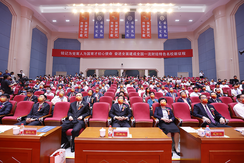 校友代表、省政协常委、东方汇泉集团董事局主席、1996级校友董方军,教师代表、全国优秀教师、管理科学与工程学院教授刘培德,学生代表、财政税务学院2019级博士研究生王晖先后发言。他们在热情洋溢、感情真挚的发言中,表达了对70年校庆的热烈祝贺,分享了对学校的感谢感激之情,表达了对学校未来的美好祝愿。