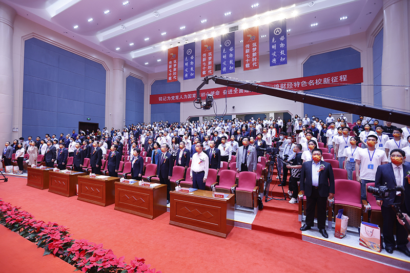上午10时许,庄严的国歌声响起,全体起立。主席台正中央,山财大校标和校庆徽标并排而立,红底白字的“山东财经大学建校70周年暨合并建校10周年庆祝大会”字样赏心悦目;主席台两侧“传薪七十载,筑梦新时代”高大立柱鲜艳夺目,标示着山财大已走过七十载风雨历程;会场后方,“铭记为党育人为国育才初心使命,奋进全面建成全国一流财经特色名校新征程”大红横幅高悬,印刻着山财大始终坚守的“克明峻德 格物致知”校训精神,整个会场一派吉庆祥和气象。