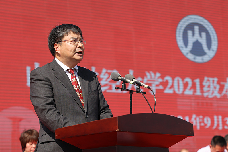 9月30日,山东财经大学2021级新生开学典礼在圣井校区田径场举行。校长赵忠秀,校党委副书记韩作生,副校长陈晓兰、张书学、张新、张培国、陶虎,纪委书记、山东省监察委员会驻山东财经大学监察专员王福岱,1988级计划统计专业校友、北京银行济南分行党委书记、行长房旭,教师代表、山东省高校青年创新团队带头人沈万芳教授等出席典礼。典礼由陶虎主持。