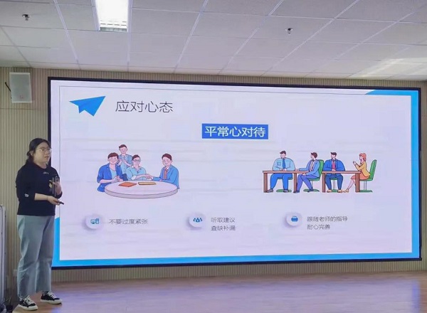 “答辩最重要的是严格守时,国赛时间规定的十分严格,回答问题尽量简明扼要,在日常演练中就要训练对陈述时间的把控。”智绘乡村团队成员靳蕊萌结合国赛经历,与现场同学分享了陈述答辩的心得感悟。“一定不能怯场,国赛现场的气氛很容易让团队产生较强的紧张感,这就需要我们在日常训练中要准备的更加充分,把每一次模拟都当做真实的‘赛场’,才能在上场时对项目内容烂熟于心,游刃有余地完成路演陈述”。