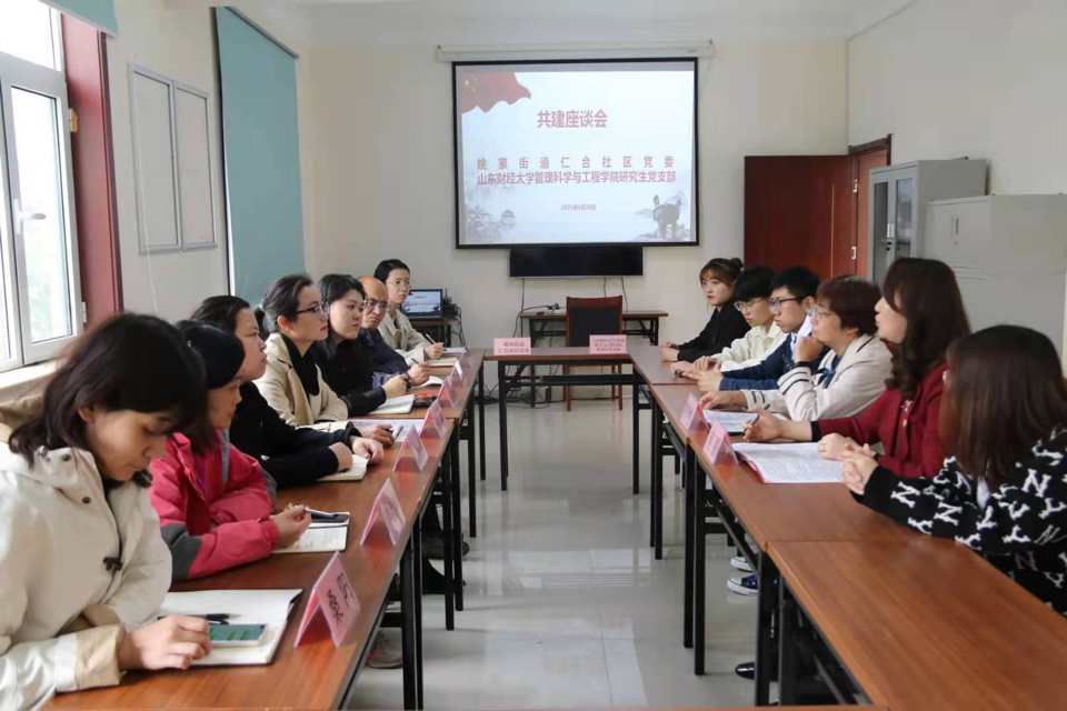 4月20日下午,山东财经大学管科学院党委与济南市历下区姚家街道仁合社区党委举行党建工作结对共建协议签订仪式。此次签约以研究生党支部为主对接社区党委,院党委副书记崔东峰、团委书记、研究生党支部书记何丽,社区党委负责人石磊、社区部分专职工作人员和学院研究生党员代表参加签订仪式。