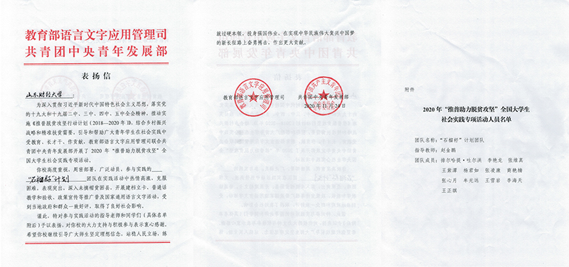 近日,山东财经大学收到教育部语言文字应用管理司和共青团中央青年发展部共同发来的表扬信,对社会实践“三千计划”“石榴籽”计划团队提出表扬。