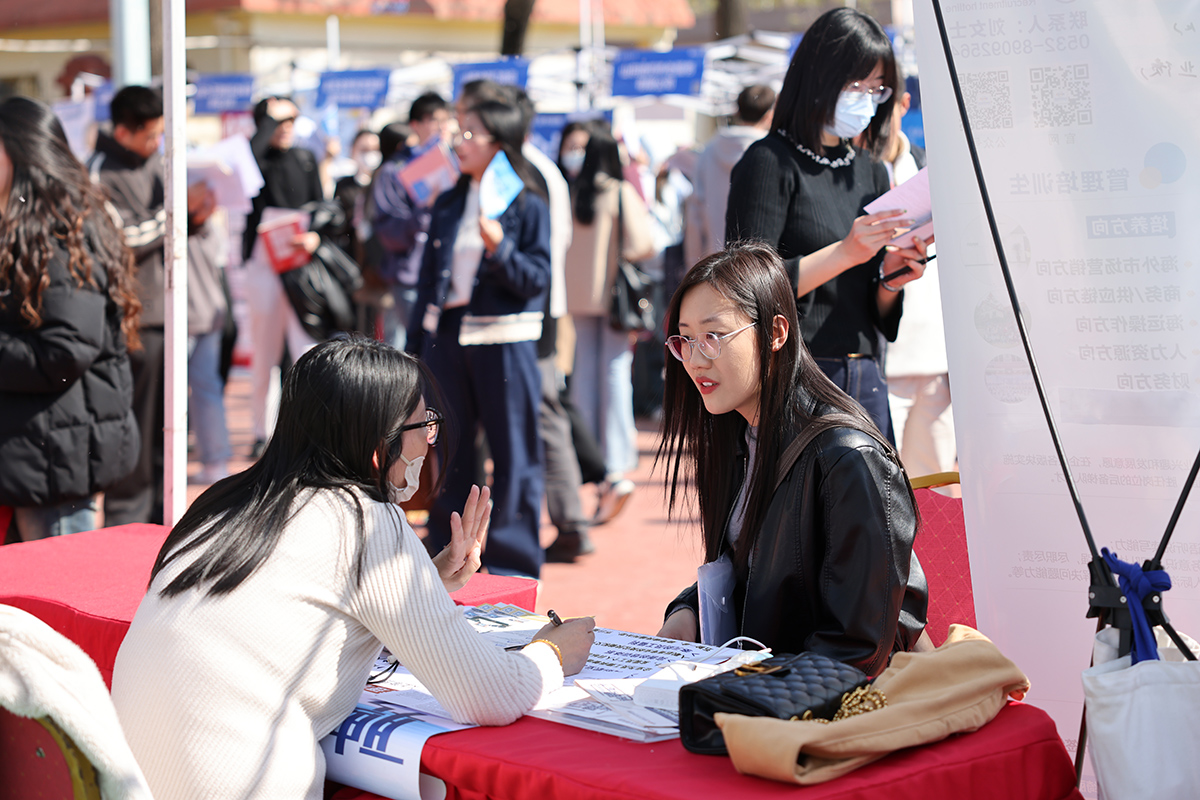 双选会现场人头攒动,毕业生们手持简历,驻足浏览岗位信息,查看单位招聘简章,就岗位职责、发展空间、薪资福利等问题与企业代表深入交流。金融学院毕业生赵俊丽说:“与单位沟通明晰了金融科技岗位能力要求,了解到济南市促进人才落户的政策,坚定了留济发展的决心。”