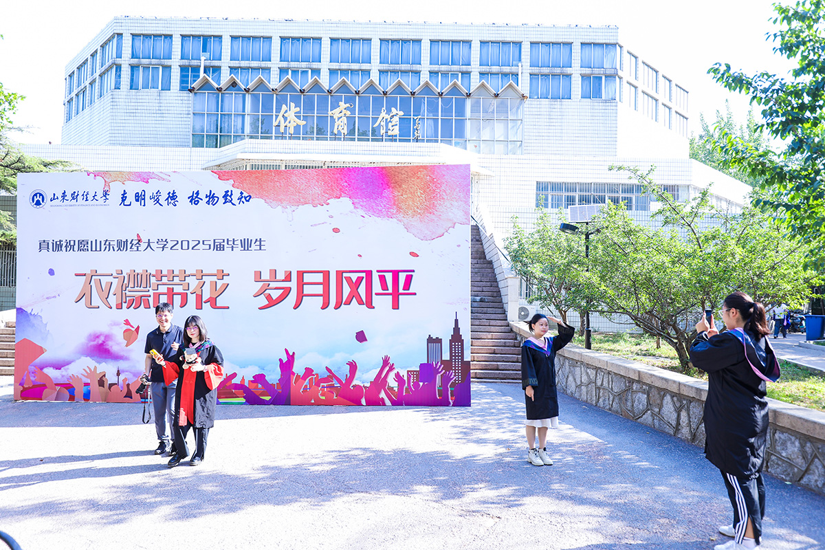 又逢毕业季,校园满别情。“衣襟带花、岁月风平”“请记住山东财经大学起源于1948年,6月9日是我们的校庆纪念日”“任凭山高路远,我与山财大心手相连,莫失莫忘”“愿你们成为最好的自己,都拥有灿烂的前程”……会场内外,绿荫道上,教学楼边,精心设计的毕业季展板、饱含惜别之情与诚挚祝福的条幅标语格外惹眼,精彩的舞龙舞狮表演,也吸引众多毕业生及其亲友的关注,大家纷纷驻足并合影留念。