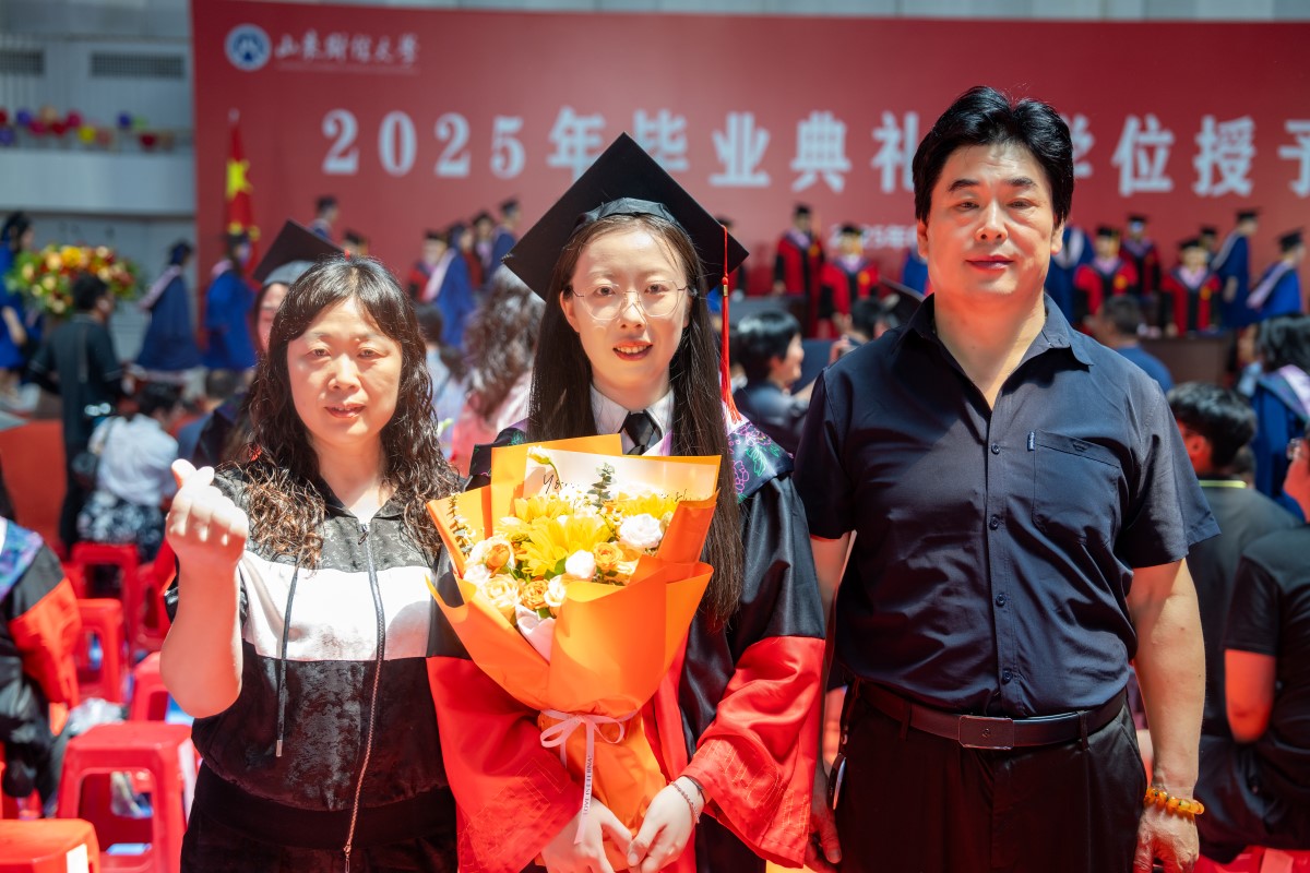 金融学院博士毕业生范文晓的父母来到了现场,一家人拍照留念,无比喜悦兴奋。范母说,“孩子硕士、博士都是在山财大就读的,感恩学校的培养、感谢导师沈丽教授的悉心栽培,祝愿山财大年年桃李、岁岁芬芳!”