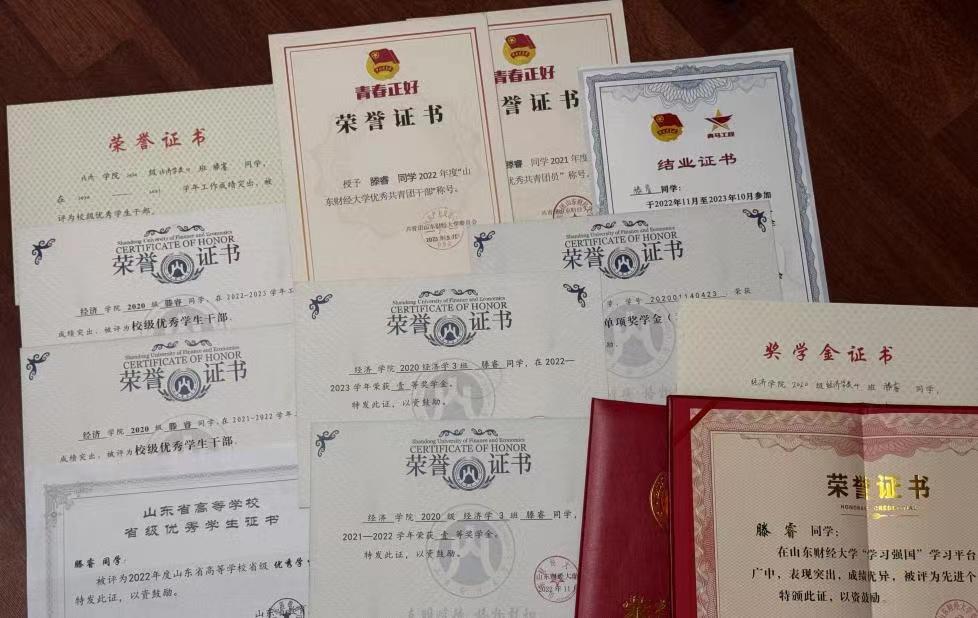 另外,滕睿在校任职期间,重视班级团支部共青团员的思想培训,积极组织开展主题团日、团支部大会、支委会会议等,团支部团员青年大学习参学率达100%,荣获山东财经大学2022-2023学年“青年大学习”工作“先进个人”称号;统筹组织学院智慧团建团员教育评议、团员发展激励录入等工作,调度学院团支部积极参与“星火传承”卓越团支部建设,并作为经济学院青马工程负责人参加校级青马工程大学生骨干培训班。鼓励团员青年积极向党组织靠拢,团支部现已有16名中共党员,23名入党积极分子,同时积极开展学习强国的打卡学习,发挥了模范带头作用,荣获校级“学习强国”先进个人。