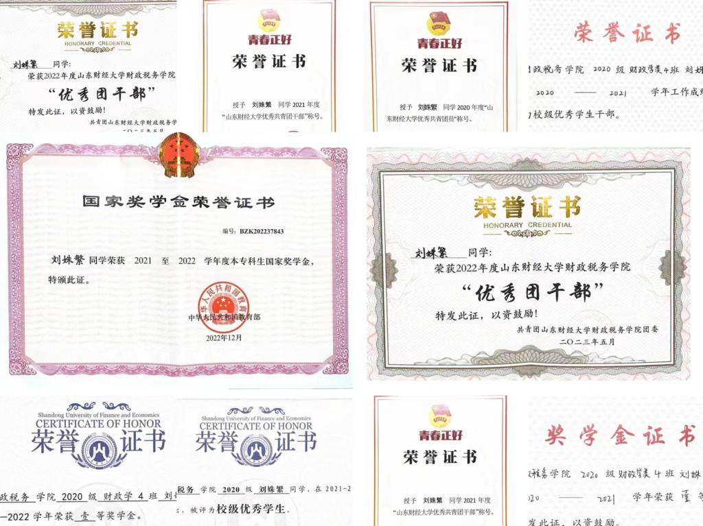 刘姝繁,中国共产党党员,山东财经大学财政税务学院财政学专业2020级本科生。曾获国家奖学金、百丞奖学金、连续三年校级一等奖学金。在校任班级团支书,曾被评为省级优秀学生干部、校级优秀团干部、校级优秀学生、校级优秀团员。本科期间,曾于天职国际会计师事务所参加审计实习工作。已考取雅思、会计教师资格证等证书,现已成功推免至西南财经大学财政学专业。