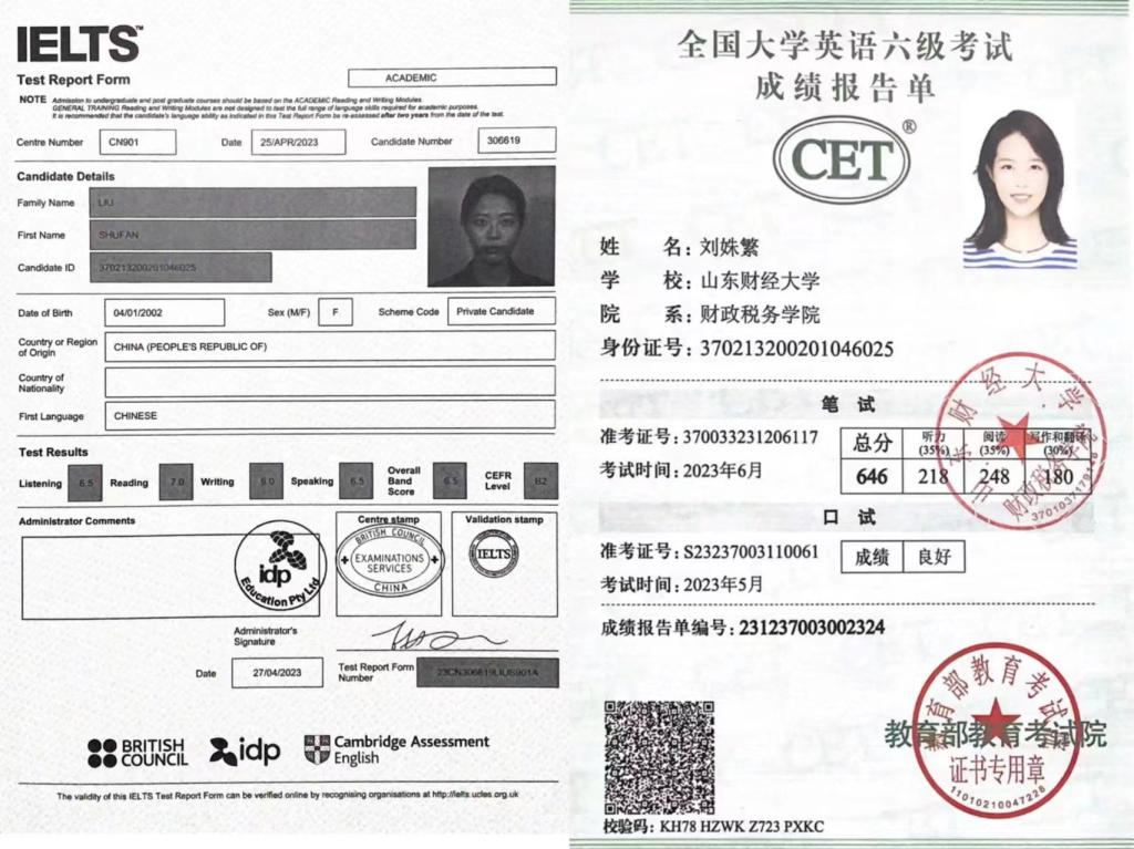 大三期间,她投入到了备考雅思的过程中,经过几个月的高强度学习,她的英语听说读写能力都提升了许多,并且在之后的六级考试中,取得了646分的分数,为她的简历增加了浓墨重彩的一笔。
