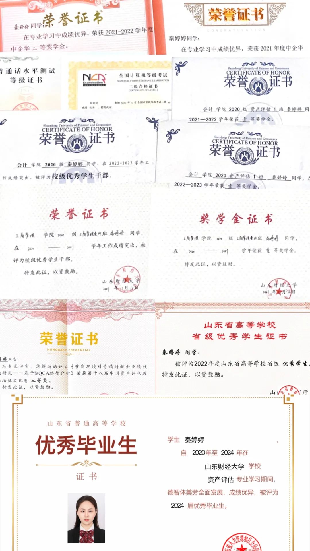 秦婷婷,中国共产党党员,山东财经大学会计学院资产评估专业2020级本科生。大学期间曾任学习委员、副班长及校级社团企业管理者协会策划部部长等职务;连续多次获得校级一等奖学金及中企华资产评估专项奖学金;曾获得省级优秀学生、校级优秀学生干部及校级优秀学生等荣誉称号。本科期间,曾参与撰写论文发表于《中国资产评估》期刊且参与到国家社科基金项目;曾获第十八届中国资产评估教育论坛征文比赛三等奖;曾任队长参加学校“三千计划”项目获“校级优秀”团队。已考取国家计算机二级、初级会计师资格等证书。现已成功推免中央财经大学财政税务学院资产评估专硕。