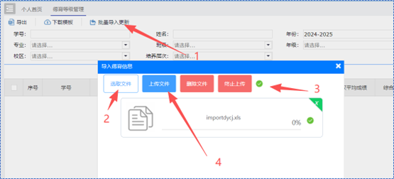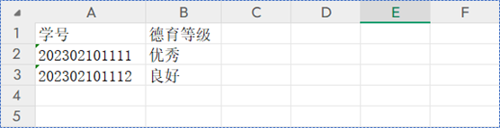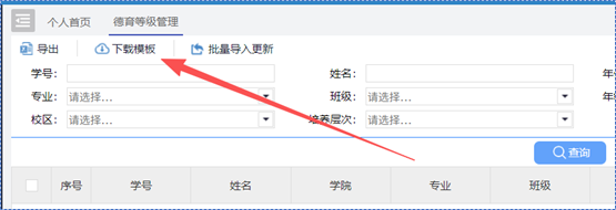 点击‘下载模版’,下载导入模板,并按模板录入学号及对应学生的德育等级。
