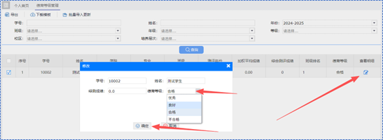 点击某学生成绩的编辑按钮,弹出修改德育等级窗口,修改德育等级之后,点击‘确定’按钮,完成修改。
