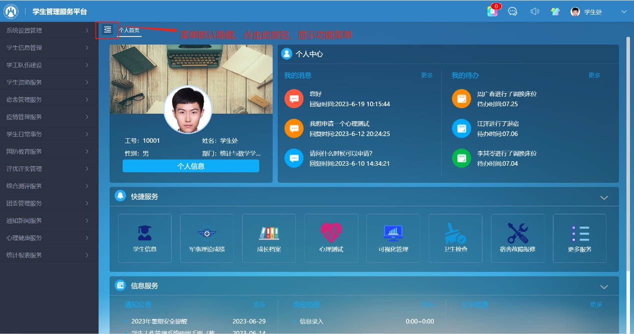 按钮可显示所有的功能菜单,鼠标放到右上角用户名上,会出现“选择角色”和“修改密码”和“退出系统”三项功能,多角色用户可通过“选择角色”来切换角色,可点击“修改密码”修改系统登密码,可点击“退出系统”退出。