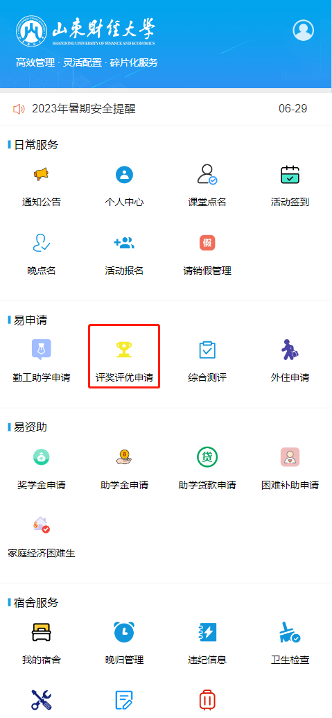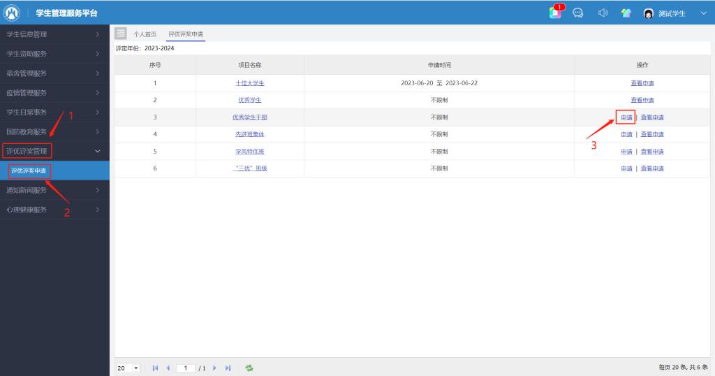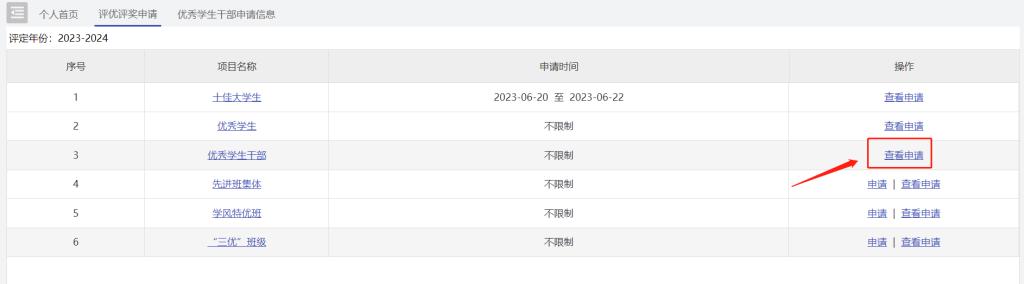 第一步、点击评优评奖申请,选择需要申请的项目,点击申请。