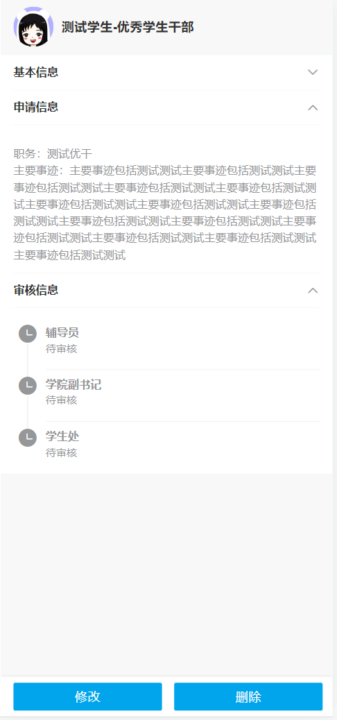 申请完成后可查看申请,查看审批进度,可修改、删除申请信息(若有部门已经进行了审批,则不能进行修改、删除)