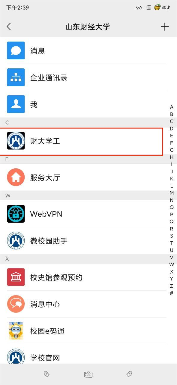 打开手机企业微信,进入主页,点击左侧上方菜单按钮,选择山东财经大学,点击下方工作台按钮进入工作台页面选择‘财大学工’应用。(企业微信进入方式)