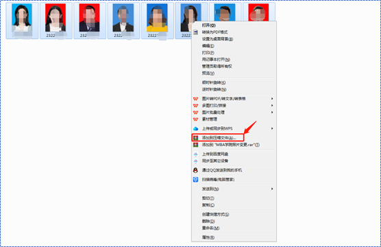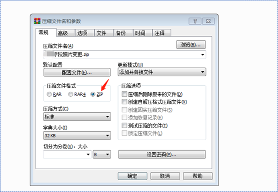 4、根目录下,全选照片,点击右键,点击“添加到压缩文件”,弹出对话框选择zip格式压缩