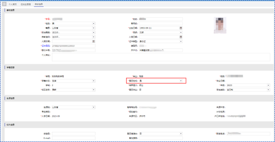 3. 进入学生基本信息编辑页面,如下图所示,有框线的均是可以编辑修改的,如‘是否在校’,修改完成点击【保存】,该按键在页面的最下方。