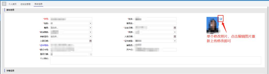 4.单个学生照片修改。进入学生基本信息编辑页面,如下图所示,点击编辑图标,重新上传照片,照片要求请查阅《学工系统(门禁)上传照片说明》https://student.sdufe.edu.cn/info/1003/4025.htm
