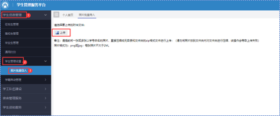 1.点击左侧导航栏【学生信息管理】,然后点击【学生管理设置】,然后点击【照片批量导入】,加载出如下页面: