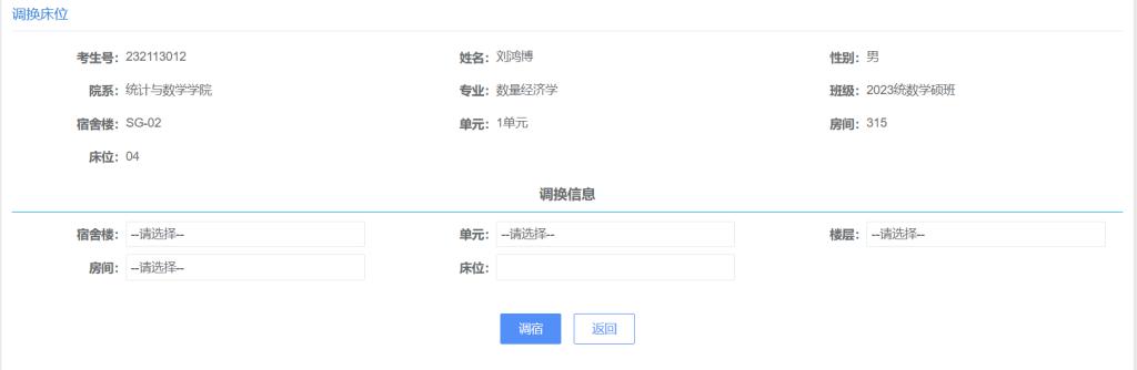 2.在操作页面选择调整信息,点击调宿按钮完成调宿。(注:被调整的床位须为空床位)