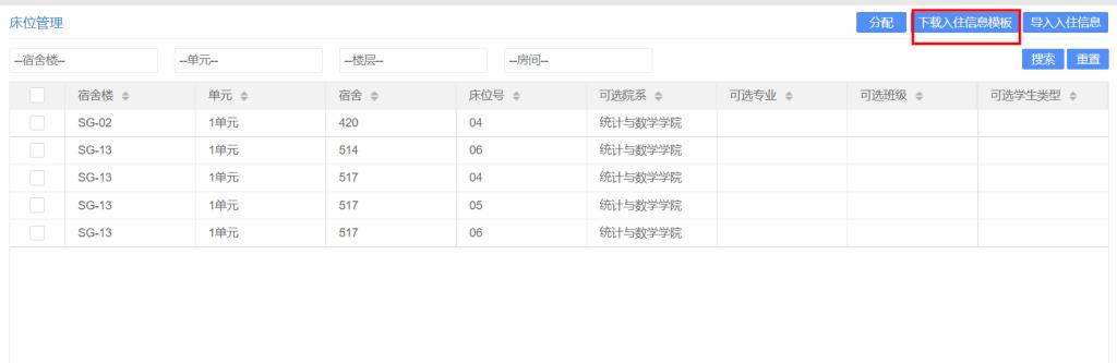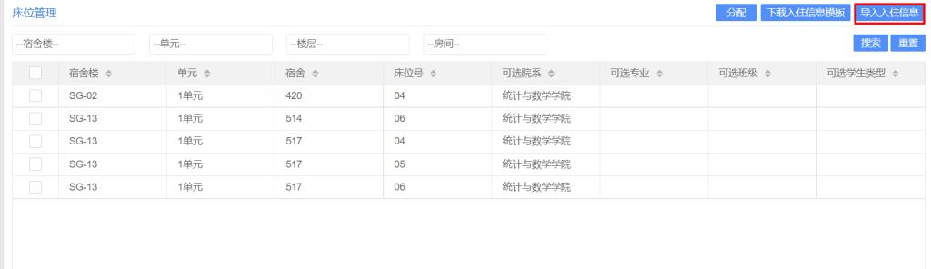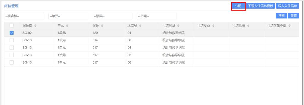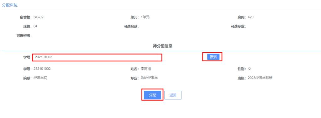 2.输入学生学号,点击搜索,核对学生信息无误后点击分配,即可完成床位分配。