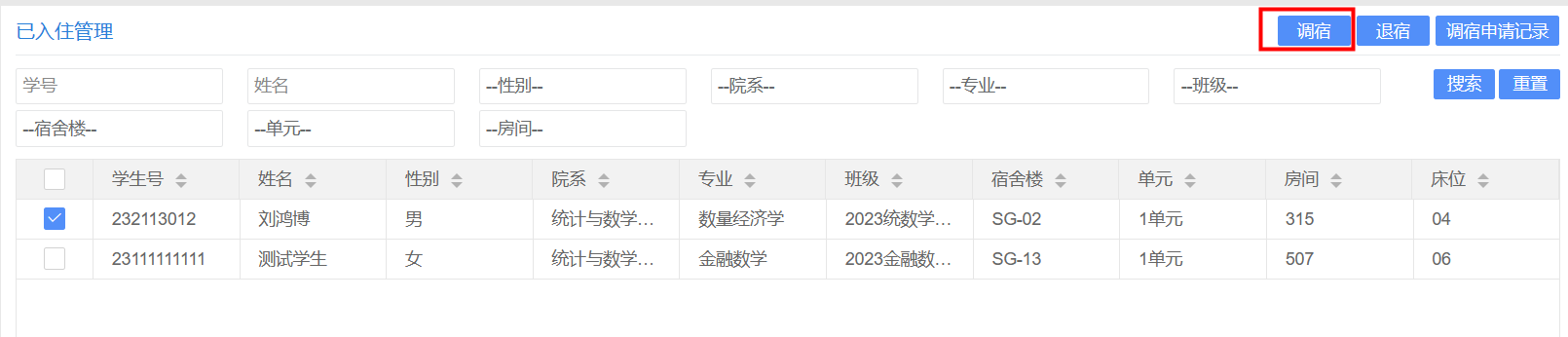1.勾选一条已入住的学生数据,点击页面右上方的【调宿】按钮,进入调宿操作页面。