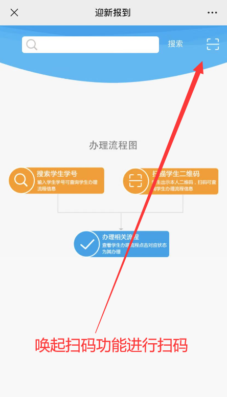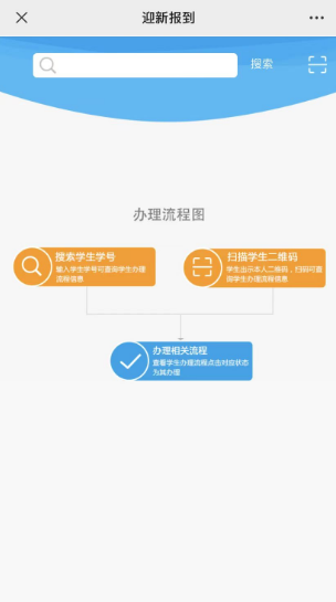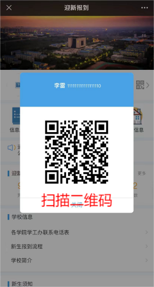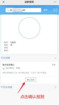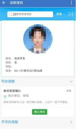 2.通过手动输入学号进行搜索,或者点击右上角扫码按钮唤醒扫码功能,扫描新生出示的个人二维码,都可以为新生确认报到。
