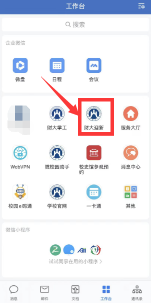 1.打开企业微信APP,点击下方“工作台”标签,点击“财大迎新”登录;