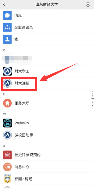 2.打开微信APP,点击下方“通讯录”标签,找到我的企业中的“山东财经大学”点击进入应用列表,点击“财大迎新”登录。