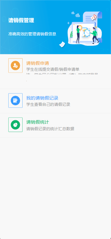1.通过企业微信工作台,或微信通讯录,进入企业“山东财经大学”中的“财大学工”应用,点击请销假管理进入请假发起页面。