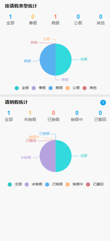 请假页面可以查看个人请假数据汇总和个人请假统计,如下图: