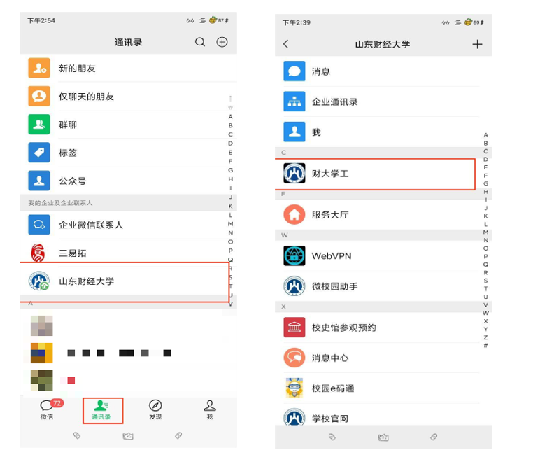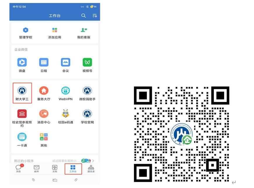 2. 入口二:打开手机微信 扫码关注山东财经大学,关注后点击进入微信“通讯录”页面,点击我的企业中的“山东财经大学”,然后点击财大学工应用进入学工系统。(微信APP进入方式)