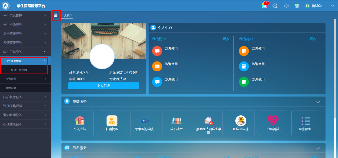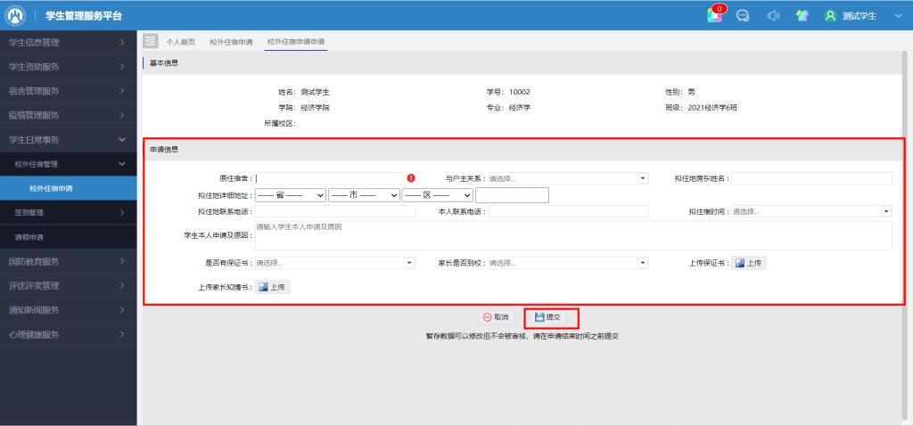 点击“学生日常事务-校外住宿申请-外住申请”,填报相关信息然后提交即可,如图2、3、4。