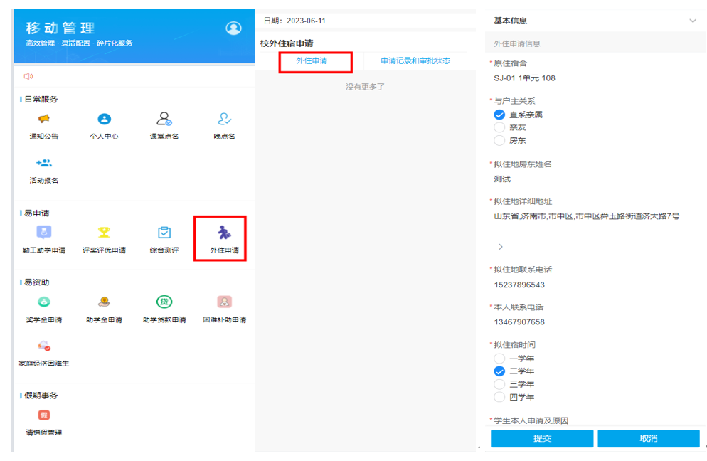 点击“外住申请--申请”,选择项目点击“外住申请”,填写相关信息之后点击提交即可发起外住申请。