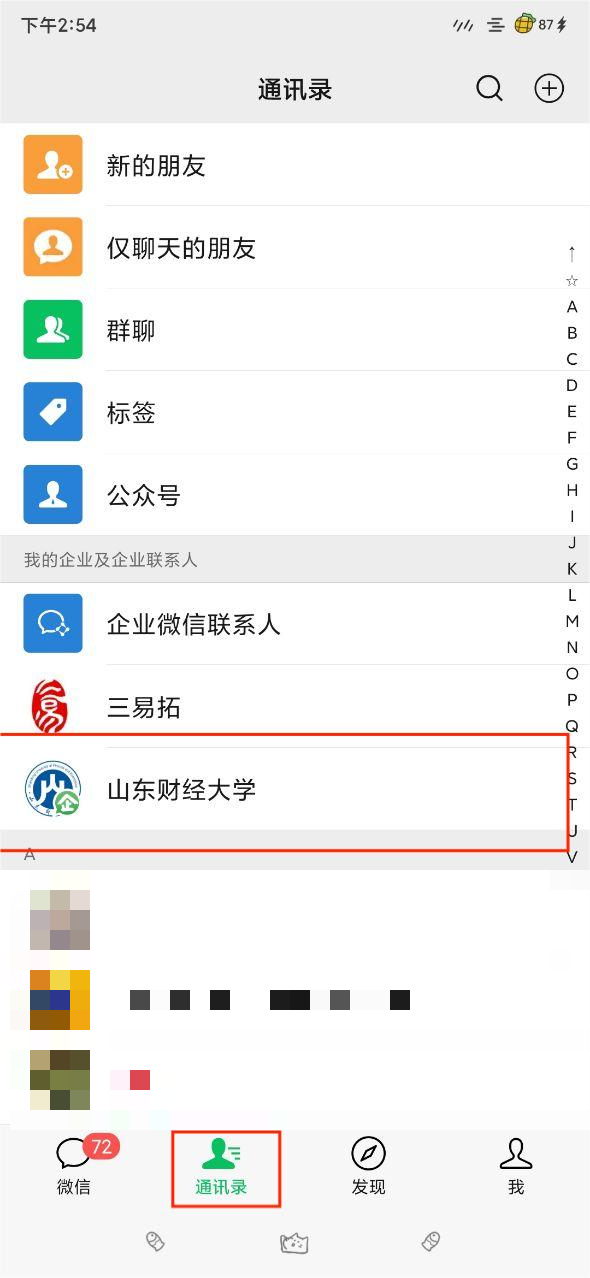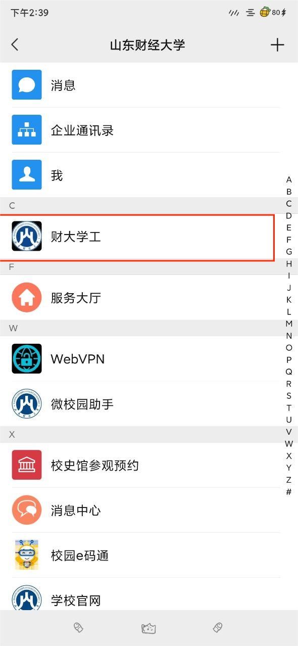 2. 入口二:打开手机微信 扫码关注山东财经大学,关注后点击进入微信“通讯录”页面,点击我的企业中的“山东财经大学”,然后点击财大学工应用进入学工系统。(微信APP进入方式)
