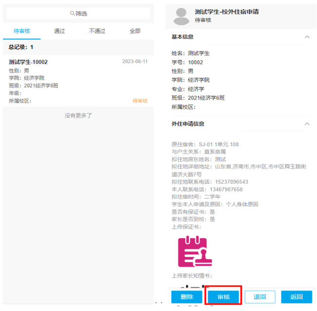 点击“外住审批--审核”,选择项目点击,查看申请信息后点击‘审核’或退回即可完成信息审核。(保证书图片为演示图片)