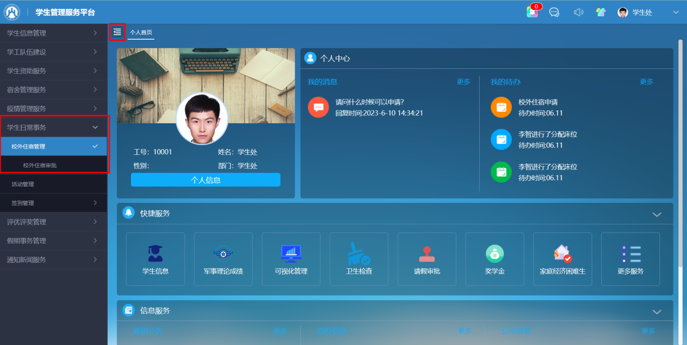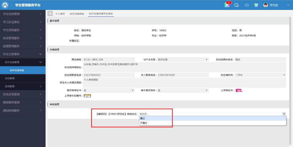 点击“学生日常事务-校外住宿管理-校外住宿审批”,审批相关信息然后提交即可,如图1、2、3、4。