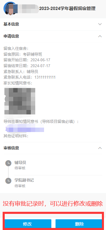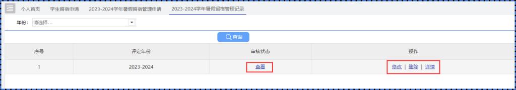 2.点击【申请记录和审批状态】,点击申请记录,可查看申请的详情及审核状态,如未审核前,可以进行修改或删除,待审批通过后可查看分配的留宿宿舍,如下图所示: