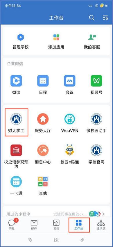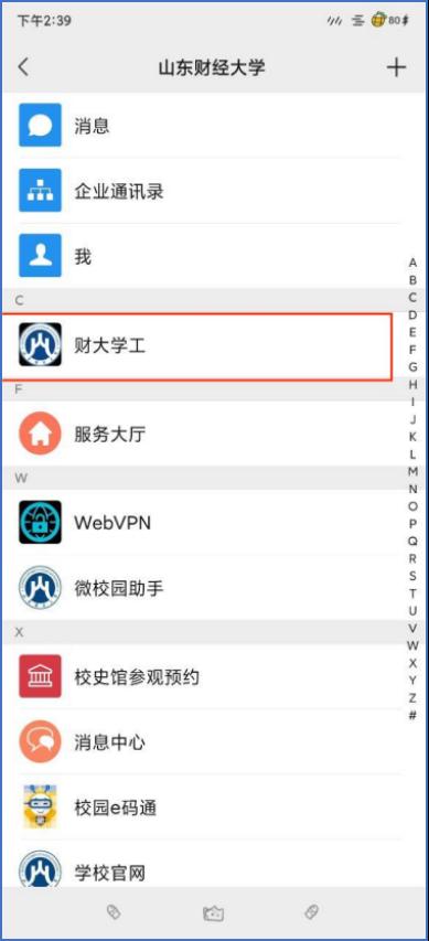 1.打开手机企业微信,进入主页,点击左侧上方菜单按钮,选择山东财经大学,点击下方‘工作台’按钮进入工作台页面选择‘财大学工’应用。(企业微信进入方式)