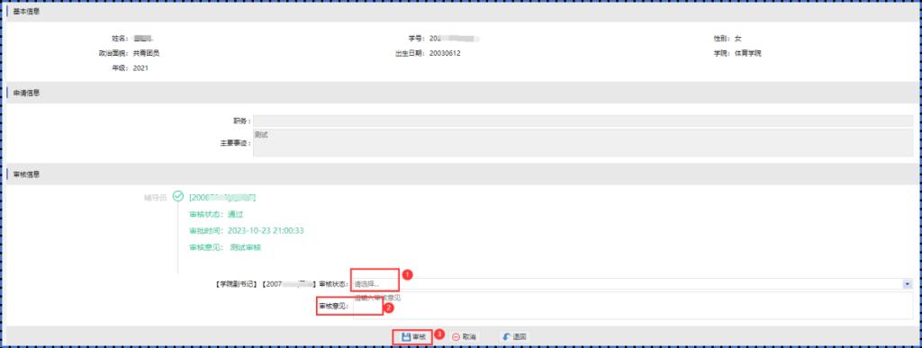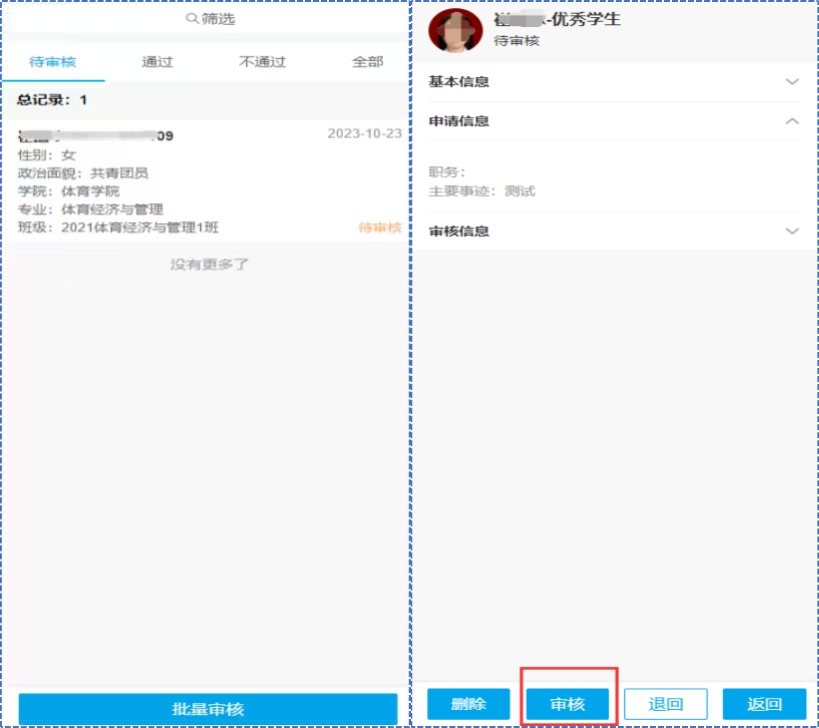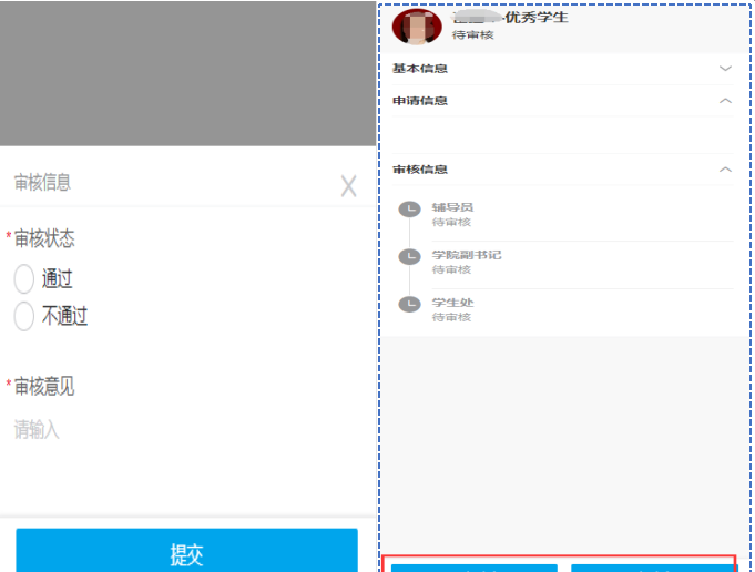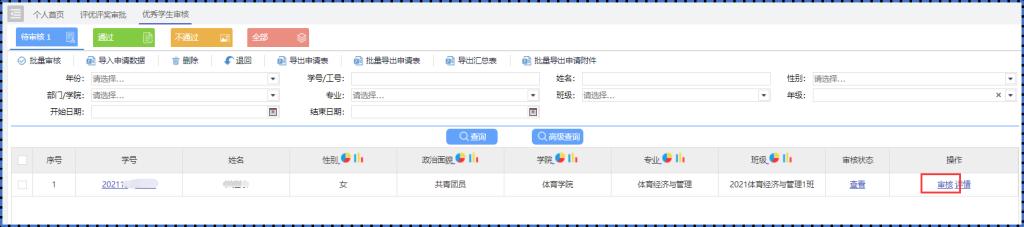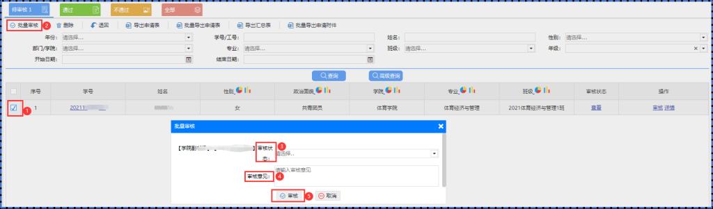 3、勾选上需要审核的学生,点击‘批量审核’,进入批量审核的页面,如下图所示:
