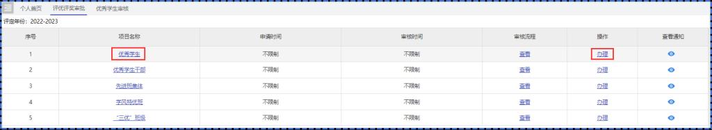 1、如下图所示,点击‘办理’进入‘优秀学生’审核页面: