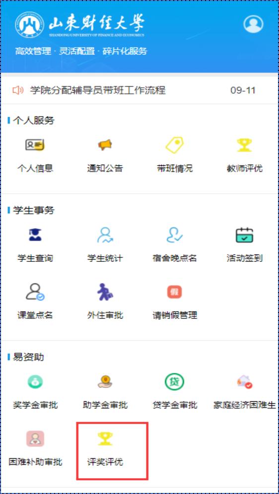 (一)模块路径:登录企业微信-工作台-财大学工-易资助-评奖评优