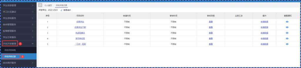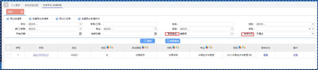 评优评奖记录模块的作用是:记录所在学院学生申请的所有数据,不论是辅导员审批‘通过’或者‘不通过’的学生